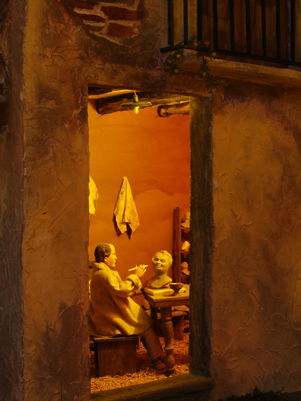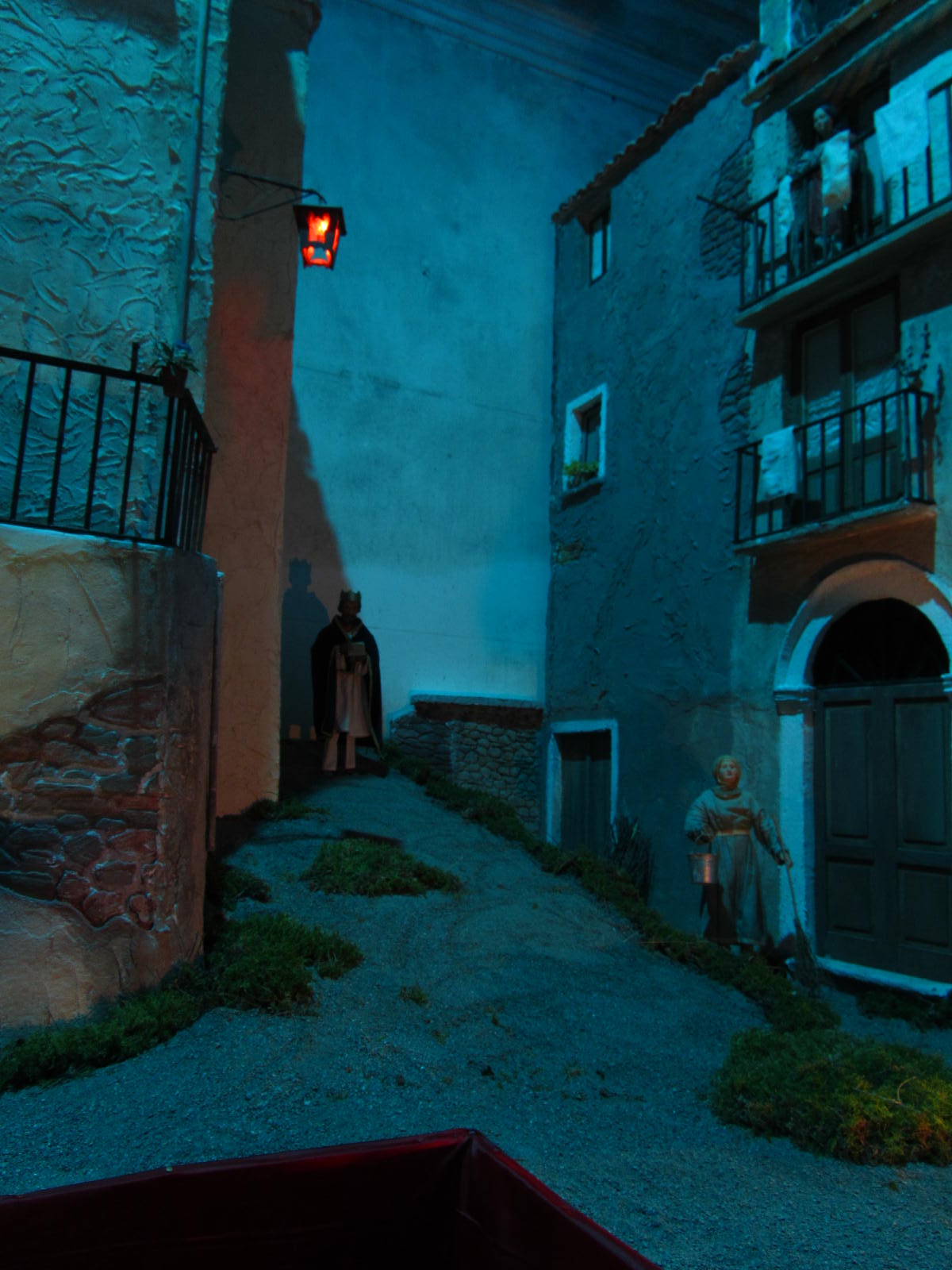 A meta della via a sinistra, u Largu, in cui nel magazzino sottostante la casa dei Gesimina il giovane mastro Girlando Politano, nel lontano 1928, creava i pastori che compongono questo Presepe, dando corpo e fattezze alle figure di una storia sacra che il Parroco Posteraro gli aveva dato nel commissionargli la pregevole opera.
